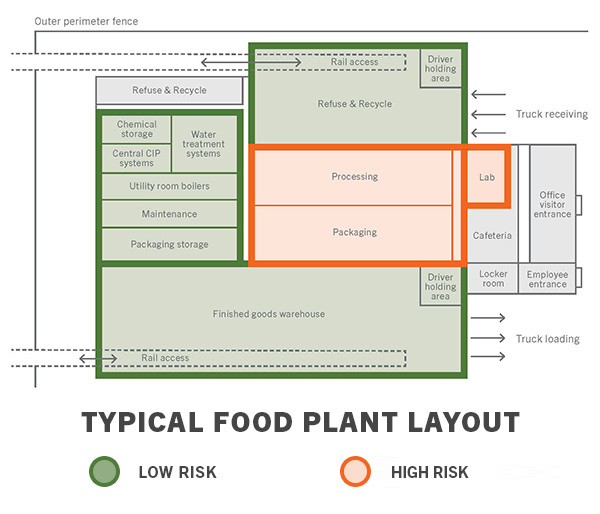 For example, meat processing, brewing, and dairy operations each place very different demands on drainage, ranging from high solids to hot liquids to large volumes of low-viscosity effluent. Drainage needs also vary by zone within a single facility. These zones can be categorized by risk level from a hygiene perspective.