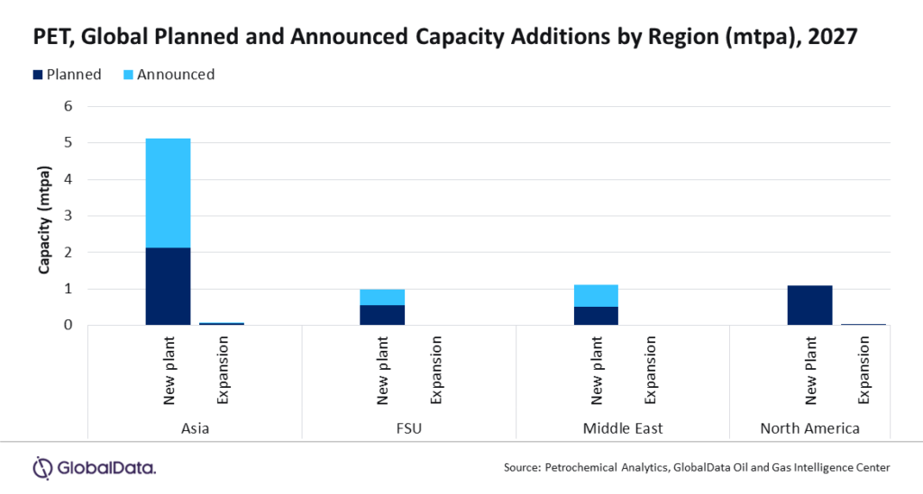 GlobalData’s latest report, Polyethylene Terephthalate (PET) Industry Installed Capacity and Capital Expenditure (CapEx) Forecasts by Region and Countries including details of All Active Plants, Planned and Announced Projects, 2023-2027, shows that the total PET capacity of new-build and expansion projects in Asia is expected to be 5.21 million tonnes per annum (mtpa) by 2027. Increased usage of plastic in end use industry segments such as food and beverages, FMCG and pharmaceuticals are the key factors for PET industry growth in Asia.