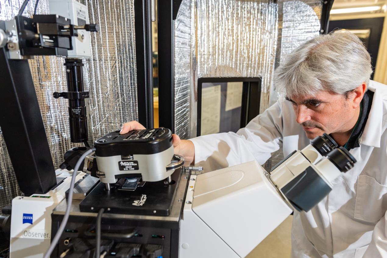 Professor Ben Whiteside, Director of Centre for Polymer Micro and Nano Technology (the Polymer MNT Centre) at the University of Bradford, works with Maria to create manufacturing methods to apply the functional surfaces to real-world products.
