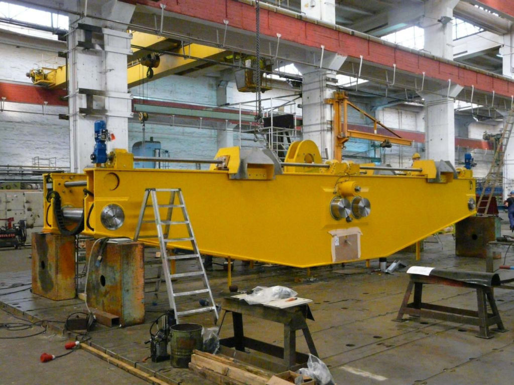 Based on these requirements, the Kranbau Köthen engineers developed a crane with a lifting capacity of 500 tons (Fig. 1) and a special heavy-duty shaft end support (Fig. 2). It consists of two carriers whose spacing is changed by lead screws.