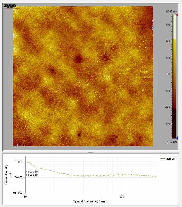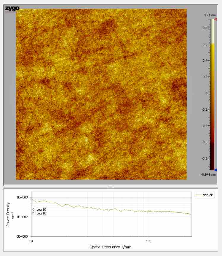 Once again, the images in Figure 4 show two polished surfaces with clearly different surface morphology, measured on a ZYGO NewView CSI profiler. These two surfaces have the same average roughness value (0.2 nm Sa), but careful analysis of the PSD plots below each shows meaningful differences.