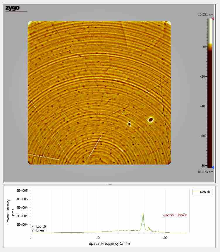 Another example of a surface where PSD is useful is shown in Figure 5, which is a diamond-turned optical surface with a clear, grooved structure that results from the single-point diamond-turning process. The PSD shows the frequency of this structure as a peak at 45 cycles per mm.