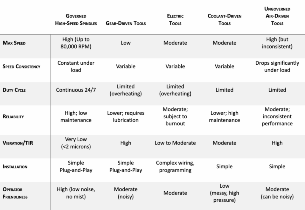 Ungoverned air-driven spindles can reach impressively high nominal ‘free speed’ RPMs, but they lack a built-in governor, resulting in immediate and substantial drop in speed and power under load. This low power output leads to inconsistent performance and results in the tool dragging on the part surface, tool wear and breakage, and less productivity compared to governed high-speed spindles.