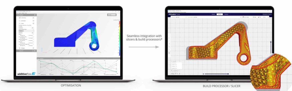 To address common challenges experienced within the Design for Additive Manufacturing (DfAM) workflow and pre-production preparation, FormFlow is a broader type of optimisation software that incorporates multiple unique functionalities enabled by specific physics-driven comparisons of the design, material, AM process parameters, and production output against key performance indicators (KPIs) as defined by specific application priorities.