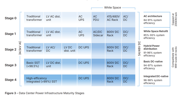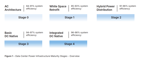 To navigate this transition, this paper introduces a five-stage maturity framework for data center power architectures, evolving from legacy AC setups (Stage 0) to an ultimate Integrated DC-native solution (Stage 4). This framework maps the industry’s potential progression through intermediate retrofit and hybrid models, which incrementally reduce AC dependencies but still carry significant system complexity and conversion penalties. Ultimately, it demonstrates that maximizing compute density requires advancing past early DC-native designs (Stage 3) to a fully streamlined Stage 4 architecture.
