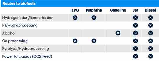 The choice of technology, as much as the choice of biofuel, is likely to be a significant determinant of success. Some forms, such as SAF and biodiesel, can be synthesised using a wide variety of technologies, from isomerisation to pyrolysis, while others such as biogasoline, have a much more limited range of technological options at present.