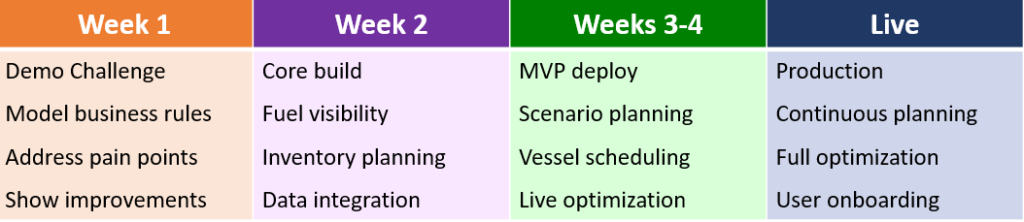 One of the most common objections fuel organisations raise when evaluating planning platforms is the implementation timeline. Enterprise software projects with 12 to 18 month go-live windows are not attractive when the planning problem is urgent today.