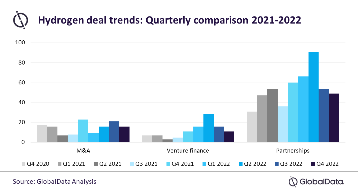 Andres Angulo, Energy Analyst at GlobalData, comments: “During 2022, over 393 deals related to hydrogen were closed, representing a significant increase compared to 277 deals registered in 2021. This shows an upward trend in the hydrogen market development, which could be decisive in achieving over 71 mtpa capacity worldwide by 2030. However, the partnerships represented 66% of the deals last year, and the number of deals decreased after Q2 2022 to numbers even below those seen in the same quarter in 2021. This could have been due to the companies trying to strengthen their core business and diversify the investment risk given the global economic situation.”