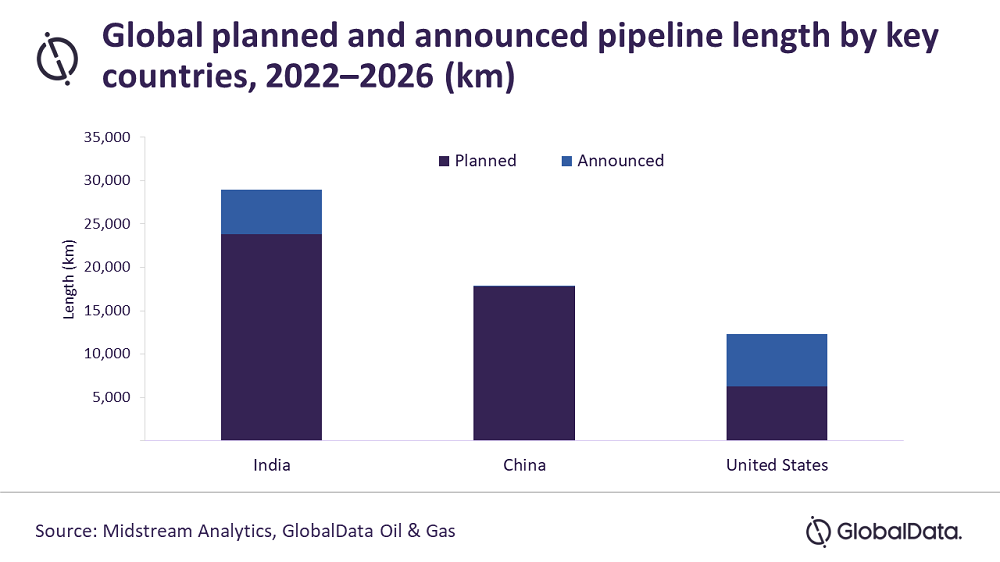 India is expected to lead in terms of global trunk/transmission pipeline length additions for planned and announced projects, contributing around 20% of the global planned and announced pipeline additions by 2026, according to GlobalData, the data and analytics company.