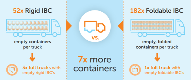 Additionally, when compared to Schütz containers, foldable plastic IBCs on average use 23% less water across all distances.