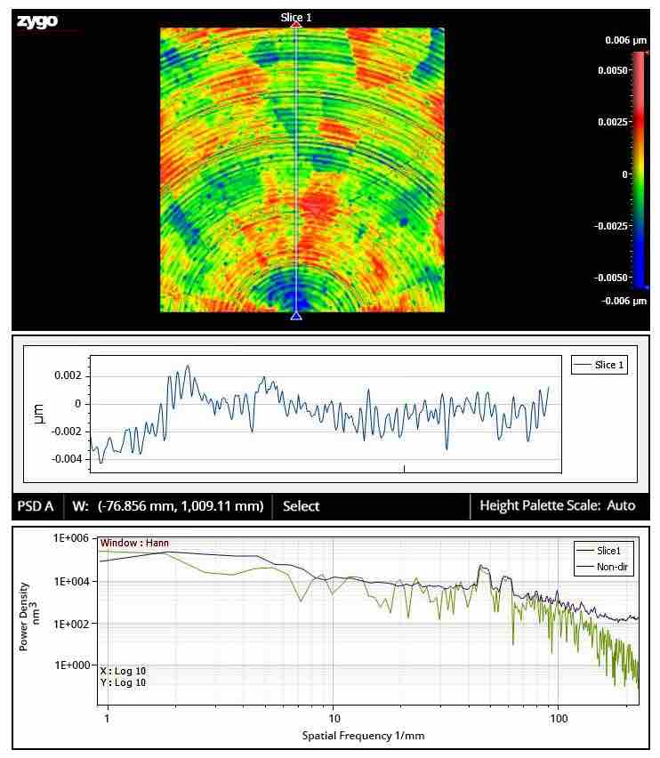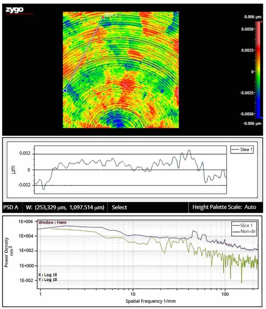 With this in mind, ZYGO’s non-directional PSD analysis provides a position insensitive PSD for the entire map, and in this way, it is simple to identify interesting surface structure (see Figures 1 and 2).