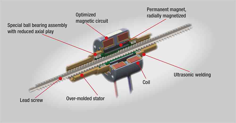 For e-pipette design, an alternative is the coreless brush DC motor. As the rotor only comprises a coil and shaft, as opposed to an iron core, it has no iron losses, which significantly improves efficiency and acceleration. As electronic pipettes are battery powered, this enables longer use from a single charge. However, brush DC motors require additional components, such as belt drives and encoders, for the conversion of rotational motion into linear motion and control of the motor. This drawback adds cost, offset against the lower initial cost of the DC motor compared to the stepper. The additional components of the DC motor system can also add the potential for errors in positional accuracy.