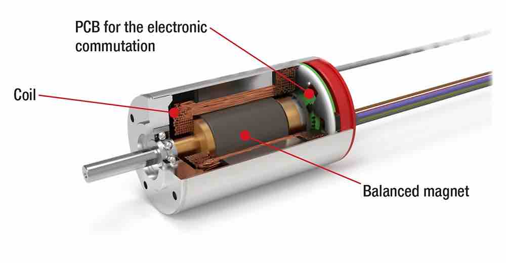 In this case, the brushless DC (BLDC) motor combines the advantages of brush DC and stepper motors. As with steppers, BLDC motors use electronic commutation, allowing for a long lifetime, but they also have a lower pole count – typically two or four poles. As a result, fewer commutations are needed for one revolution of the motor, enabling BLDCs to rotate at a faster speed. With a well-balanced rotor and a strong ball bearing assembly, speeds of up to 100,000 rpm is possible with a BLDC motor. Compact by design, BLDC motors also provide high power density.